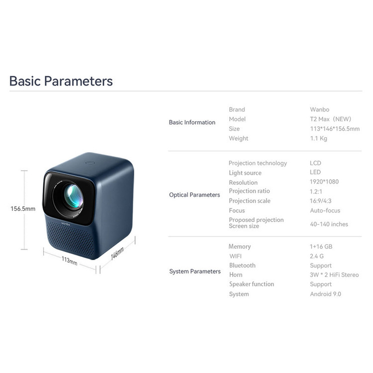 روشنایی:450 لومن رزولوشن:1920x1080 p کنتراست تصویر:1:2000 سیستم عامل:اندروید ورژن 9 حافظه داخلی:1+16 گیگابایت نسخه بلوتوث:ورژن 4 وزن:1.1 کیلو گرم وای فای:2.4G زوم : اتوماتیک