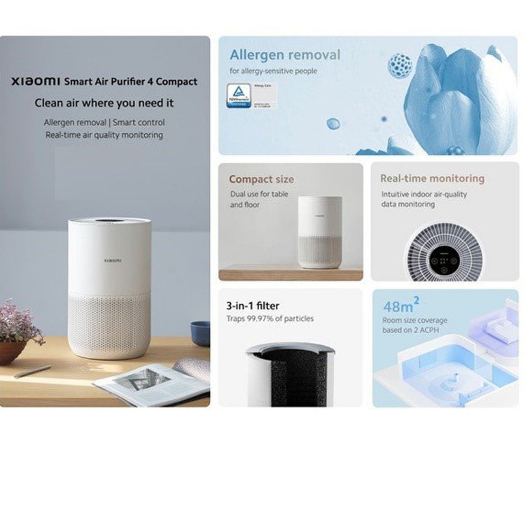 دستگاه تصفیه هوای هوشمند شیائومی 4 کامپکت، هوای تمیز را در جایی که به آن نیاز دارید ارائه میدهد. این یک محصول نوآورانه، به ویژه برای افراد حساس به آلرژی است. همانطور که از نام آن پیداست، به عنوان جمعوجور طراحی شده است. میتوانید برای میز و کف از دستگاه تصفیه هوا استفاده کنید. مجهز به فیلتر 3 در 1 است. ذرات کوچکی به اندازه 0.3 میکرون را به دام میاندازد. اندازه دستگاه تصفیه هوای هوشمند شیائومی 4 کامپکت کوچک است؛ اما ویژگیهای آن بزرگ است. هوای تازه آن، خستگی را از بین میبرد و از سلامت تنفسی خانواده شما محافظت میکند. بی سر و صدا کار میکند، زمانی که دستگاه تصفیه هوا کار میکند میتوانید کار کنید. دستگاه تصفیه هوای هوشمند 4 کامپکت 99.97 درصد ذرات کوچک 0.3 میکرون را به دام میاندازد. دارای فیلتر 3 در 1 برای تصفیه است. میتواند آلایندههای هوای داخل خانه را لایه به لایه از بین ببرد. برخلاف دیگر دستگاههای تصفیه هوای شیائومی که طراحی جعبهای شکل دارند، دستگاه تصفیه هوای هوشمند 4 کامپکت دارای فرم استوانهای و رومیزی است. وزن آن فقط 2.2 کیلوگرم و دارای قطر 220 میلیمتر و ارتفاع 355 میلیمتر است. علاوه بر این، دارای 230 متر مکعب بر ساعت CADR و سنسور PM 2.5 IR است. در حالی که فاقد حسگرهای دما و رطوبت است که در سری 4 تصفیهکننده هوای هوشمند بزرگتر یافت میشود، مدل جمعوجور میتواند بوی باکتریها و آلرژنهای رایج مانند موهای حیوانات خانگی و گرده را فیلتر کند. علاوه بر قابلیت حمل، از مزایای دستگاه تصفیه هوای هوشمند 4 کامپکت، میتوان به میزان نویز و مصرف انرژی اشاره کرد. این پاککننده تنها با حداکثر توان مصرفی 27 وات در مقایسه با نسخه Lite با خروجی 33 وات رتبهبندی شده است. سطح نویز در حالت خواب 20 دسیبل است و در حداکثر تمیز کردن به 50 دسی بل میرسد.