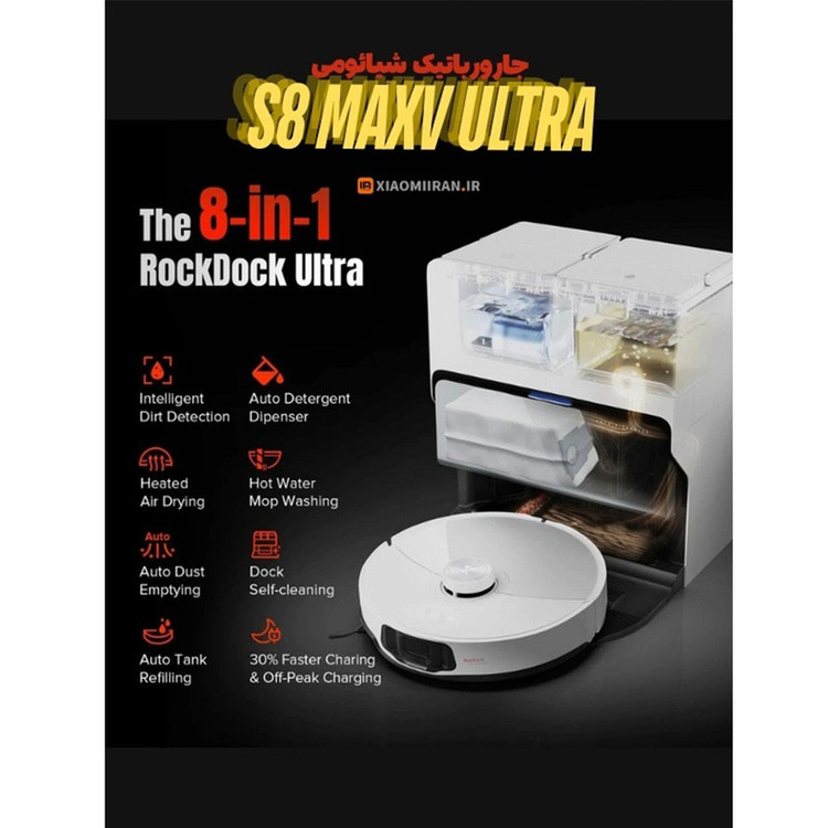 طراحی و ساختار Roborock S8 MaxV Ultra حالا بریم سراغ Roborock S8 MaxV Ultra که یکی از جدیدترین و پیشرفتهترین مدلهای جارو برقی رباتیک شیائومی است. این مدل با طراحی متفاوت و تکنولوژیهای پیشرفته خود، توانسته توجه بسیاری از خریداران را جلب کند. یکی از نقاط قوت اصلی Roborock S8 MaxV Ultra، سیستم ناوبری دوگانهی آن است که از لیزر و دوربین استفاده میکند. این سیستم به دستگاه کمک میکند تا با دقت بیشتری موانع را تشخیص داده و از برخورد با آنها جلوگیری کند. همچنین، این جارو برقی رباتیک دارای سیستم تشخیص موانع هوشمند است که به طور خودکار ارتفاع موانع را تشخیص داده و از آنها عبور میکند. این دستگاه دارای بدنهای مقاوم و با کیفیت است که علاوه بر زیبایی، دوام بالایی نیز دارد. طراحی مدرن و براق آن باعث میشود تا به راحتی در هر خانهای جلب توجه کند. همچنین، این مدل دارای یک صفحهنمایش LED است که وضعیت دستگاه را به صورت زنده نمایش میدهد. عملکرد و تجربه کاربری Roborock S8 MaxV Ultra Roborock S8 MaxV Ultra با قدرت مکش 8000 پاسکال، یکی از قویترین جارو برقیهای رباتیک در بازار است. این دستگاه میتواند با قدرت بالا و دقت بینظیر، حتی ذرات بسیار ریز را نیز از روی سطوح مختلف جمعآوری کند. سیستم ناوبری دوگانه لیزری و دوربین این جارو برقی رباتیک، به آن اجازه میدهد تا به صورت بسیار دقیق و هوشمندانه در فضای خانه حرکت کند و از برخورد با موانع جلوگیری کند. Roborock S8 MaxV Ultra نیز از سیستم شستشوی هوشمند بهره میبرد که میتواند مقدار آب مورد نیاز برای شستشوی سطوح را به صورت خودکار تنظیم کند. این دستگاه همچنین دارای مخزن گرد و غبار با ظرفیت بالاتر است که نیاز به تخلیه مکرر را کاهش میدهد. ایستگاه تخلیه بقیه ویژگی های پاک کردن آن مربوط به اسکله جدید طراحی شده آن است. . این هنوز یک داک تخلیه خودکار است که محتویات سطل زباله ربات را به طور خودکار خالی می کند، و همچنان به طور خودکار پد شستشوی جارو رباتیک MaxV Ultra S8 را می شویند و مخزن شستشوی آن را که اوج سیستم های مراقبت از کف خودکار است، دوباره پر و خالی می کند. اما، داک جدید به صورت استاندارد با سیستم خشک کردن پد خشک کن خودکار عرضه میشود که در طی چند ساعت، پد پاککن را خشک میکند، که باعث بهداشتیتر شدن آن میشود.