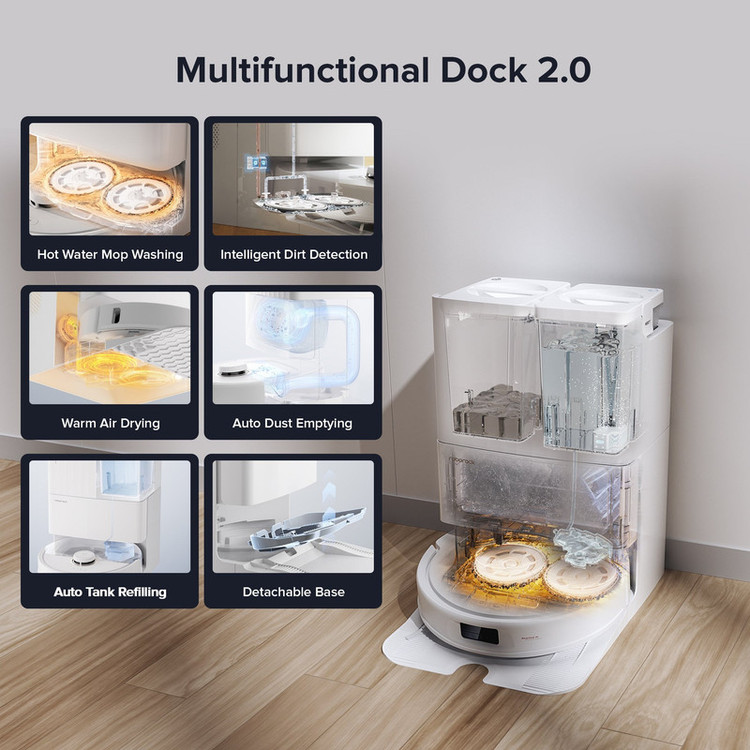 جارو رباتیک Roborock Q Revo Max V با استفاده از جدیدترین فناوری Single All-Rubber Brush و به لطف قدرت مکش فوق العاده 7000Pa، به طور موثری کثیفی را از انواع مختلف کفپوشها پاک میکند و به تمیز کردن عمیقتری روی فرشها دست مییابد و سرعت برداشت مو را بهبود میبخشد و در عین حال گره خوردن کمتر را تضمین میکند. این یک انتخاب ایده آل برای خانوادههای شلوغ با حیوانات خانگی است. با این جارو شستشوی خودکار موپها، خشک کردن،تخلیه گردوغبار نهایت راحتی را تجربه کنید. طراحی جارو رباتیک شیائومی Qrevo MaxV هرچند ظاهر جارو رباتیک معیار مهمی برای انتخاب و خرید آن نیست، ولی جارو رباتیک Qrevo MaxV بسیار شبیه جارو رباتیک Qrevo بوده و داخل پکیج آن یک داک عمودی و با ابعاد نسبتاً بزرگ دیده میشود. ایستگاه داک دو مخزن آب بزرگ دارد که از بالا قابل دسترسی هستند. یکی از آنها از 4 لیتر آب تمیز پر شده و دیگری 3.5 لیتر آب آلوده را در خود نگه میدارد. به جز این دو مخزن آب، یک کیجای میگیرد. طراحی این محصول کاملاً مینیمال است و نباید انتظار داشته باشید المان خاصی را به دکور شما اضافه کند. از نظر اندازه، داک نسبتا جمع و جور و باریک بوده و ابعاد آن 340 در 487 در 512 میلی متری دارد. با این حال، همچنان برای خانههایی با فضای محدود، گزینه مناسبی نیست. قدرت مکش جارو رباتیک شیائومی Qrevo MaxV باید اعتراف کنیم این جارو رباتیک شیائومی از لحاظ عملکرد مکشی واقعاً عالی است. قدرت مکش بالا تنها مزیت این جارو (Roborock Qrevo MaxV robot vacuum) نیست، چرا که شیائومی این دستگاه را با هوش مصنوعی ادغام کرده است. حتی جارو رباتیها نیز از هوش مصنوعی مستثنی نیستند. بنابراین با یک «Hello Rocky» ساده، ربات هوشمند در خدمت شما خواهد بود. ربات جاروبرقی قادر است در مجموع شش کار را از طریق فرمان صوتی انجام دهد: باتری جارو رباتیک شیائومی Qrevo MaxV عمر باتری 5,200 میلی آمپر ساعتی عالی است. کمپانی سازنده تا 180 دقیقه زمان اجرا را وعده میدهد و ربات حدود 70 متر مربع را در طول 94 دقیقه تمیز خواهد کرد. در حالی که حدود نیمی از باتری خود را مصرف کرده و نیاز به شارژ دوباره ندارد. وابسته به میزان کثیفی و تنظیمات قدرت مکش، می تواند تا 300 متر مربع را با یک بار شارژ تمیز کند. همچنین هنگامی که باتری به سطح 13 درصد برسد.
